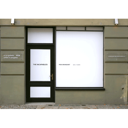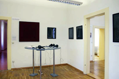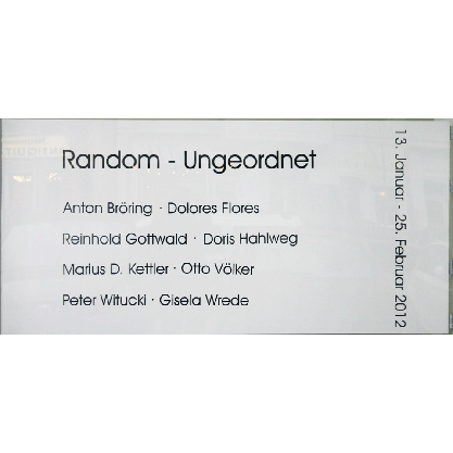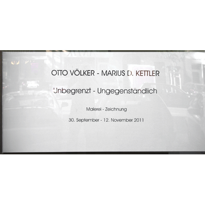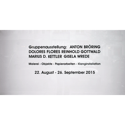 21.9.-20.12.2015 paintings / communication 22.8.-26.9.2015 Bröring,Flores,Gottwald,Kettler,Wrede 6.6.-18.7.2015 actus mundus~ Malerei - Klanginstallation Marius D. Kettler 20.2.4.4.2015 Installation und kleinere Arbeiten Reinhold Gottwald 5.9.-18.102014 Leuchtobjekte Dolores Flores 8.4.-24.5.2014 Objektbilder Anton Bröring 14.2.-29.3.2014 Malerei Gisela Wrede 18.1.-8.2.2014 Ausstellungsvorschau Bröring, Flores, Gottwald, Kettler, Wrede 25.10-7.12.2013 Video Installation Pasi Granqvist 13.9.-18.102013 Zeichnungen Peter Witucki 20.4.-24.5.2013 Installation und Malerei Reinhold Gottwald 5.3.2013 Installation and Objects Dolores Flores 22.9.-27.10.2012 Malerei Gisela Wrede 8.6.-21.7.2012 Zeichnungen Peter Witucki 20.4.-2.6.2012 Objektbilder 2.3.-14.4.2012 Eine Installation Doris Hahlweg, Otto Völker 13.1.-25.2.2012 Anton Bröring, Dolores Flores, Reinhold Gottwald, Doris Hahlweg, Marius D. Kettler, Otto Völker, Peter Witucki, Gisela Wrede 18.11.2011-31.12.2011 Anton Bröring, Dolores Flores, Reinhold Gottwald, Marius D. Kettler, Friedbert Rupp, Otto Völker, Peter Witucki, Gisela Wrede, Hu Xiang 30.9.-12.11.2011 Otto Völker - Marius D. Kettler Malerei und Zeichnung 19.8.-24.9.2011 Hu Xiang Papierarbeiten - Video 25. 6. - 30. 7. 2011 Seth Cluett Klanginstallation 21. 5. - 18.6. Marius D. Kettler Klang - Video - Installation 2. 4. - 7. 5. 2011 Reinhold Gottwald Installation 19. 2. - 26.3. 2011 Dolores Flores Skulpturale Installationen und Leuchtobjekte 15. 1. - 12. 2. 2011 Reinhold Gottwald, Hu Xiang, Dolores Flores, Otto Völker, Marius D. Kettler Arbeiten auf Papier und Holz 13.11 - 11. 1. 2011 Aussichten Otto Völker: Malerei und Papierarbeiten 10. 9. - 30. 10. 2010 Marius D. Kettler: Malerei und Pigmentplastiken 25. 2. - 26. 8. The past and the present 2010 Dolores Flores: Skulpturen, Reliefe Marius D. Kettler : Malerei The Golem: Objekte 1. 12. 2009 - 19. 1. 2010 Johann Manfred Kleber , Mit ESSEN SPIELT MAN NICHT Skripturen und Installation 7. 9. - 9. 10. 2009 Flores, Kettler, Völker 22. 9. - 27. 9. 2009 Otto Völker: Malerei M.D. Kettler: Klang Installation und Malerei Dolores Flores: Installation und Objekte 23.7. - 26. 8. 2009 The Golem: Video, Objekte Hu Xiang: Installationen Marius D. Kettler: Klang Installationen 9. 6. - 18. 7. 2009 Contributive Contrairians Dolores Flores Lumineszierend Installationen und Objekte 14.4. - 30.5.2009 3 Farben Otto Völker Malerei 13.2. - 4.4. 2009 Vorsatz und Verhüllung Marius D. Kettler Actuistische Strukturbilder und Klangobjekte 6.1. – 1.2. 2009 Otto Völker: Malerei, Papierarbeiten Marius D. Kettler: Actuistische Strukturbilder Dolores Flores: Objekte 2008 11.11. - 24.12. 2008 219168 hours Dolores Flores Marius D. Kettler Projektshow: zwei Künstler, zwei Wege, ein Ziel. Gemeinsame Projekte von 1986 – 2008 Video, ARTkustik live performance 30.10. – 2.11. 2008 Berliner Liste Otto Völker: Malerei Marius D. Kettler: Klangkunst, Actuistische Malerei Dolores Flores: Installation, Objekte Balavat: Objekte 5.9. – 24.10. 2008 „Wat kieksten, wassup“ Johann Manfred Kleber Skripturen – Assoziationen 10.7. – 30.8. 2008 Abstract Structure Paul Kaminski: Malerei Dolores Flores: Skulptur 23.5. – 3.7. 2008 Klunst Marius D. Kettler Klangkunst Installationen 11.4. – 15. 5. 2008 „Nichtkunst für Fortgeschrittene“ Balavat Material, Bilder, Objekte, Texte 21.2. – 29.3. 2008 Power to the beer people Dolores Flores Installation, Objekte 15.2. – 19.2. 2008 Karlsruhe Hu Xiang: Malerei Anna und Jenny Berndtson: Objekte Otto Völker: Malerei Balavat: Objekte Dolores Flores: Installation, Objekte Marius D. Kettler: Klangkunst, Actuistische Malerei 5.1. – 16.2. 2008 Multiple Choice Hu Xiang, Marius D. Kettler, Dolores Flores Multiples, Objekte 2007 10.11. – 29.12. 2007 „Stringent“ Marius D. Kettler Actuistische Anblitzbilder und Donner-Objekte 2.9. – 5.11 2007 Künstler der Galerie Marius D.Kettler, Dolores Flores, The Golem, Hu Xiang Malerei, Grafik, Video, Installation 16.8. – 16.9. 2007 Kassel Hu Xiang: Video, Installation, Grafik Anna Berndtson: Performance “Self stress relief“, Video, Photo und Objekte mit Jenny Berndtson The Golem: Objekte, audio-visuelle Raum-Installation Marius D. Kettler: Klang-Installation, Video, Actuistische Malerei Dolores Flores: Installation, Objekte, Video 17.7. – 11.8. 2007 Johann Manfred Kleber: Skripturen Paul Kaminski: Malerei The Golem: Objekte Hu Xiang: Grafik Dolores Flores: Skulpturen Marius D. Kettler: Actuistische Malerei 25.5. – 12. 7. 2007 „upload, download, overload“ Dolores Flores Installation, Objekte, Video 28.3. – 5.5. 2007 Otto Völker: Malerei, Papierarbeiten Marius D. Kettler: Klang-Objekte 19.2. – 24.3. 2007 ARTkustik, sound canvas Dolores Flores und Marius D. Kettler Lyrische Klangexperimente 12.2. – 24.3. 2007 „Alle warten auf den Messias, Ich warte auf eine neue Welt“ The Golem audio-visuelle Rauminstallation, Objekte 2006 17.10. – 31.12. 2006 „Actuistische Bildbeschreibungen und Klanginstallationen" Marius D. Kettler Actuistische Malerei, Klangkunst 23.9. – 28.10. 2006 Anna Berndtson Video, Photography, Performance „Gudrun“ 4.8. – 2.9. 2006 „Polarität 1“ Otto Völker: Malerei Johann Manfred Kleber: Skripturen Marius D. Kettler: Klanginstallation Dolores Flores: Skulpturen Paul Kaminski: Malerei 27.6. – 29.7. 2006 ARTkustik Project ARTkustik (Dolores Flores und Marius D. Kettler) art into music, mixed media music presentation 13.6. – 29.7. 2006 Gemischte Realität H.G. Winter: Malerei Dorothea Schutsch: Malerei Dolores Flores: Papier-Reliefe Marius D. Kettler: Malerei 28.4. – 3.6. 2006 „ Janus Kadel Malerei, Collagen, Objekte 14.4. – 8.6. 2006 Gemischte Gemüter III Dorothea Schutsch: Malerei The Golem: Objekte Marius D. Kettler: Klangobjekte Dolores Flores: Skulpturen Janus Kadel: Malerei,Collagen 1.3. – 15.4. 2006 Actuistische Schrift und Klangbilder Marius D. Kettler Actuistische Schriftbilder, Klanginstallationen, liv